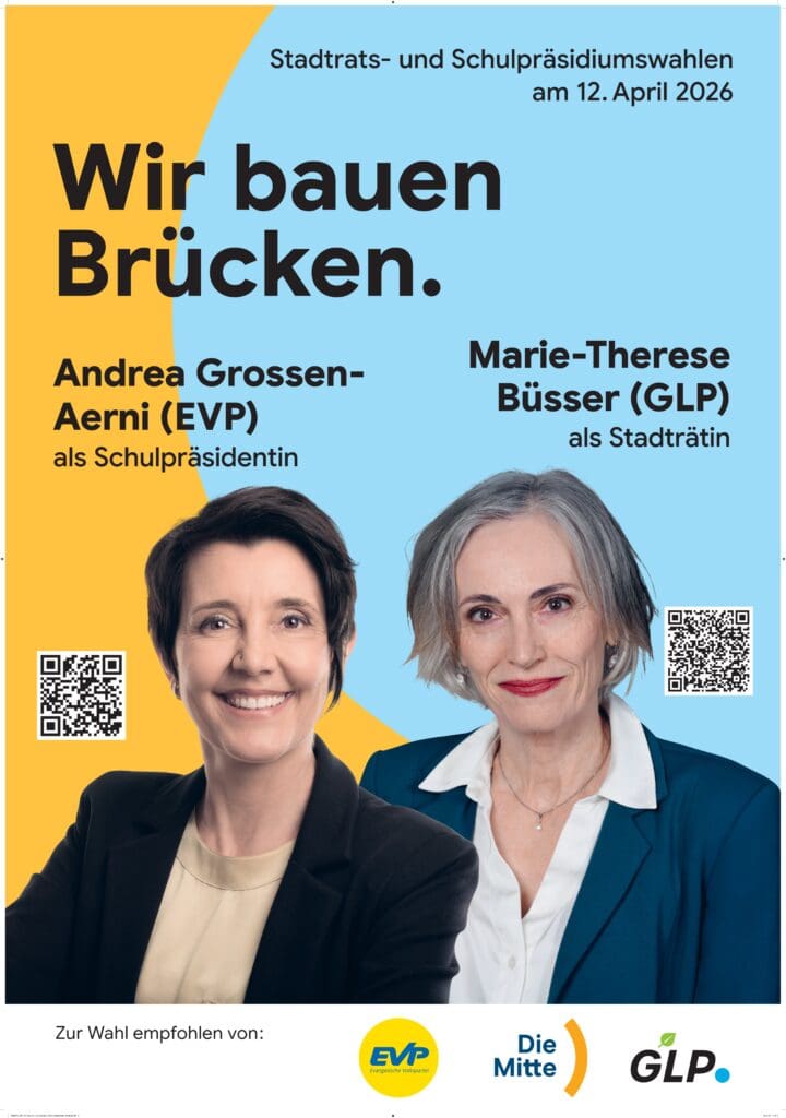 Die Evangelische Volkspartei (EVP), die Mitte-Partei (Mitte) und die Grünliberale Partei (GLP) arbeiten im Parlament seit 4 Jahren erfolgreich als Brücke-Fraktion zusammen. Sie präsentieren nun auch für die Exekutiv-Wahlen in Wetzikon vom 12. April 2026 gemeinsam ihre Kandidatinnen, Marie-Therese Büsser (GLP) für den Stadtrat und Andrea Grossen-Aerni (EVP) für das Schulpräsidium. Ziel ist es, das politische Zentrum auch im Stadtrat zu stärken und vernünftige, umsetzbare Lösungen zu ermöglichen.